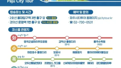 시티투어 버스타고‘타본김에 파주일주’…4월 2일부터 운행 시작 - 파주 대표 관광지 잇는 시티투어 버스 파주시는 대표 관광지를 권역별로 연계한 ‘파주시티투어’ 버스를 4월 2일...