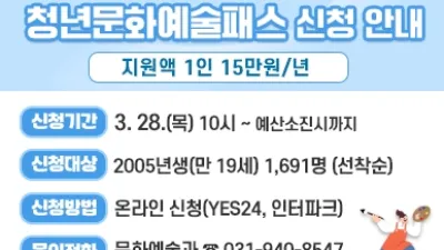 2024-03-29 00:41:13파주시, 청년문화예술패스 3월 28일부터 발급 개시 - 2005년생(만 19세) 청년 대상, 최대 15만 원 지급