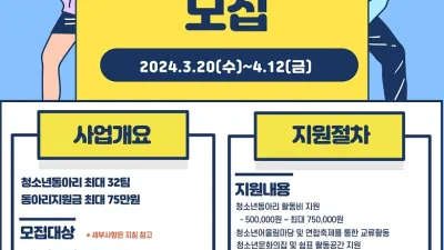 파주시가 청소년의 동아리 활동을 응원해 - 4월 12일까지 청소년동아리 지원 사업 참여동아리 모집 파주시는 청소년이 다양한 특기를 계발하고 공동체 활동을 경험할 수 있는 ‘청소년동아리 지원 사업’에 참여할 청소...