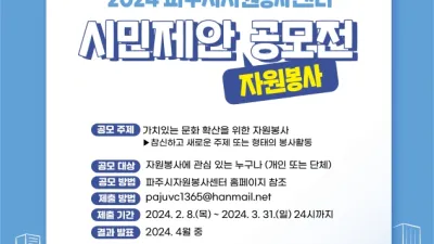 2024-03-20 05:29:56파주시자원봉사센터, 자원봉사 아이디어 공모‘시민제안 공모전’