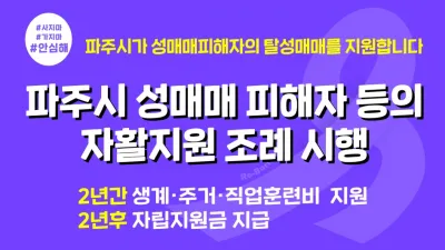 파주시, 성매매집결지폐쇄 분위기 속 다섯 번째 지원자 나와 - 문 닫은 업소 늘고, 기존 지원자 4명 소식에 탈성매매·자활지원 신청 결심 - 생계··주거·직업훈련비 등 최대 4,420만 원 2년간 지원, 올해 말까지만 ...