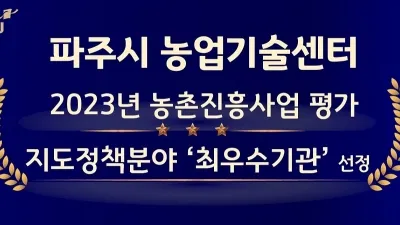 파주시농업기술센터, 2023년도 농촌진흥사업 평가 지도정책분야 ‘최우수기관’선정 파주시농업기술센터가 경기도 주관 2023년도 농촌진흥사업 평가 지도정책분야에서 최우수기관으로 선정됐다. 농촌진흥사업 ...