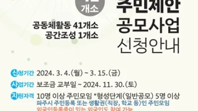 파주시, 3월 15일까지 ‘마을공동체 주민제안 사업’공모 - 공동체 단계별 3백만 원~2천만 원 사업비 지원 파주시는 ‘2024년 마을공동체 주민제안 공모사업’에 참여할 마을공동체를 3월 ...