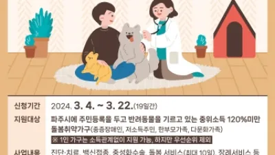 2024-03-04 01:59:19파주시, 취약가구 반려동물 병원비 - ‘자부담 0%’…최대 20만 원 지원
