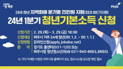 파주시, 1분기 청년기본소득 3월 29일까지 신청 - 4월 20일, 지역화폐 25만 원 지급 예정 파주시는 2월 29일부터 3월 29일까지 청년의 사회참여 촉진 및 사회적 기본권 보장을 위한 ‘2024년 1분기 청년기본소...