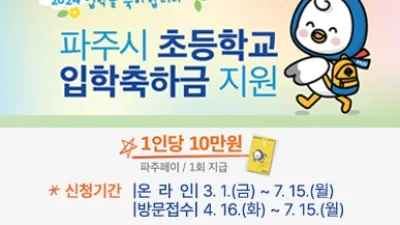 행복한 교육도시 파주,‘초등생 입학축하금’10만 원 지급 - 5억 원 예산 편성해 지원…첫 학교생활 응원 파주시는 초등학교 1학년에 들어가는 입학생이 있는 모든 가정에 입학 축하의 의미를 담은 입학...