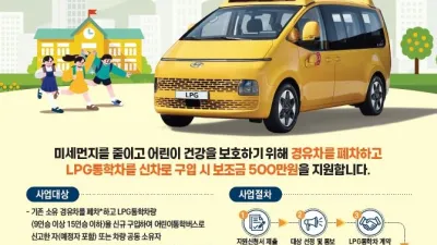파주시, 어린이 통학차량 엘피지(LPG)로 교체하면 500만 원 지원 -14대 총 7천만 원 지원, 오는 26일부터 신청 파주시는 어린이의 건강을 보호하고 미세 먼지를 줄이기 위해 어린이 통학차량의 엘피지(LPG)차 전환 지원사업을...