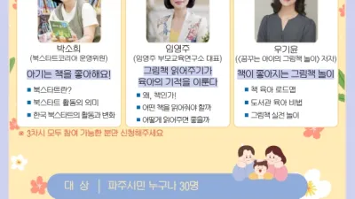 책과 함께 인생을 시작하자…파주 한울도서관, ‘북스타트 양육자’ 교육 - 오는 26일부터 30명 선착순 모집 파주 한울도서관은 오는 3월 파주시민 30명을 대상으로 북스타트 양육자 교육...