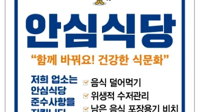 파주시, 2024년도 안심식당 지정업소 모집 파주시는 안전하고 위생적인 외식문화 조성과 선진화된 식문화 보급 확산을 위해 안심식당 지정 희망 음식점을 신규 모집한다. 안심식당은 음식을 공유해 나눠 먹는 등 감염병에 취약...