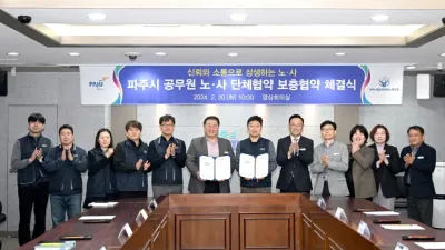 2024-02-21 05:25:24파주시 공무원노조, ‘근무시간 면제(타임오프제)’시행 발판 마련 - 파주시와 공무원노조 단체협약 보충협약 체결.