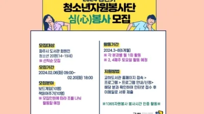 2024-02-06 13:59:23파주시 교하도서관, 오는 20일까지 청소년 자원봉사단 심(心) 봉사 모집