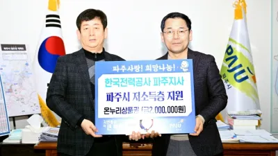 한국전력공사 파주지사, 파주시에 설맞이‘온누리 상품권’전달 파주시는 6일 한국전력공사 파주지사에서 설맞이 저소득 취약계층을 위한 온누리상품권 200만 원을 전달받았다고 밝혔다. 전달식에는 김진기 파...