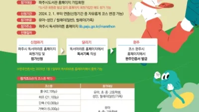 2월 1일부터 파주시 독서마라톤 대회 시작 -풀코스 등 1개 선택해 책을 읽고 독서일지 작성하면 ‘완주’ 파주시는 2월 1일부터 2024년 제18회 독서마라톤 대회를 운영한다. 지난 2007년부터 ...
