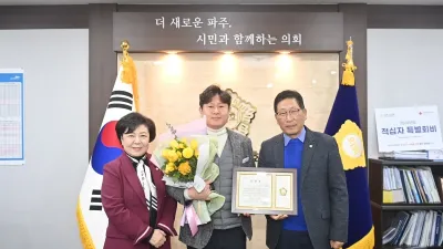 파주시의회 1월 칭찬공무원‘공공건축과 우상탁 팀장’선정 파주시의회는 이달의 칭찬공무원으로 윤희정 부의장이 추천한 공공건축과 우상탁 공공건축2팀장을 선정했다. 우 팀장은 금촌 다목적 실내체육관 건립과...