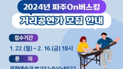 거리공연 활성화…파주시,‘파주온(On)버스킹’ 거리공연가 모집 - 30개의 팀 선발 예정, 팀별 인원수에 따라 공연비 지원 파주시는 2월 16일까지 ‘파주온(On)버스킹’ 사업...
