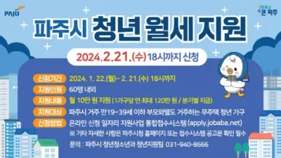 2024-01-22 01:31:28파주시, 청년 월세 지원 사업 상반기 참여자 60명 모집