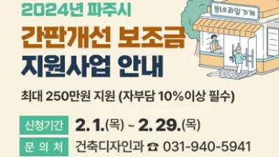 파주시, 간판개선 보조금 지원…업소당 최대 250만 원 -2월 1일부터 29일까지 참여 업소 60개소 모집 파주시는 ‘2024년 파주시 간판개선 보조금 지원사업’을 추진함에 따라, 2월 1일부터 2...