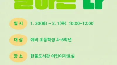 파주 한울도서관, ‘미술’ 주제로 겨울 독서교실 운영 파주 한울도서관은 겨울방학을 맞아 1월 30일부터 2월 1일까지 독서교실을 운영한다. 독서교실은 미술을 주제로 총 3차...