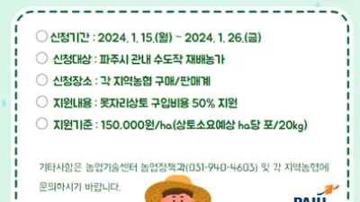 2024-01-19 05:24:47파주시, 청년후계농 안정적 정착 돕는다… 오는 31일까지 지원 대상 모집