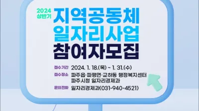 2024-01-19 05:20:09파주시, 오는 31일까지 상반기 지역공동체일자리 참여자 모집