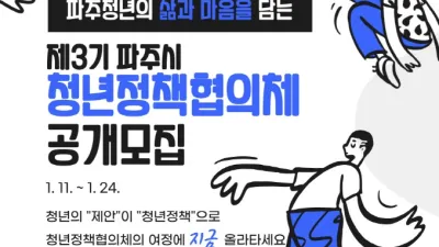 파주시 청년 정책을 이끌어갈 청년 리더를 모집합니다 - 제3기 파주시 청년협의체 구성원 모집 경기 파주시가 1월 24일까지 제3기 파주시 청년정책협의체(이하 ‘청년협의체’) 구성원을 모집한다. 청년협의체는 청년...