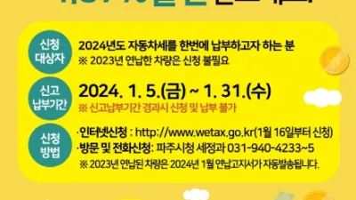 파주시, “자동차세 1월에 한 번에 내고 할인받으세요” - 연납 신고·납부 시 4.57% 세액공제       파주시가 일 년에 두 차례 내는 자동차세를 1월에 한 번에 납부하면 연세액의 4.57%를 공제받을 ...