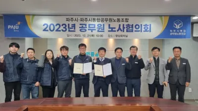 파주시, 공무원 노조와 노사협의회 개최 - 직원 근무여건 개선 등 위한 안건 24건 합의         파주시는 21일 시청 영상회의실에서 파주시통합공무원노동조합과 노사협의회를 개최하고 직원 근무여건 개선 등을 위한 24건의 안건에 ...
