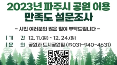 2023-12-15 02:46:57파주시, 시민의견 수렴 위해 공원 이용 만족도 조사 실시 - 오는 24일까지 시 누리집, 정보무늬(QR코드) 통해 참여 가능