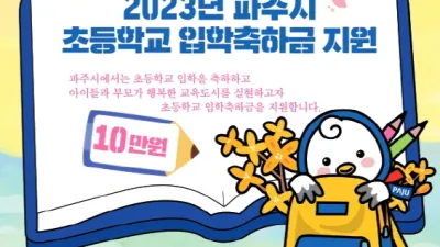 파주시, 올해 ‘초등학교 입학축하금’4억 7천여만 원 지급 완료 - 초등 신입생에게 입학축하금 10만 원씩 지급…아이들의 첫 학교생활 응원       파주시는 초등학교(대안 교육기관 초등과정 포함) 1학년 신...