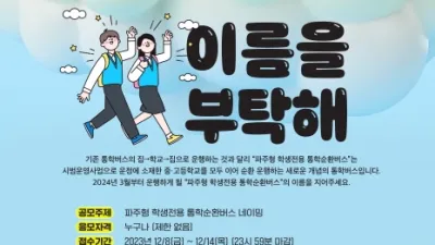 파주시, 경기도 최초 파주형 학생전용 통학순환버스 네이밍 공모전 개최 - 학교와 학교를 잇는 통학순환버스 브랜드 개발 첫걸음       파주시는 12월 8일부터 14일까지 ‘파주형 학생전용 통학순환버스(이하 통학순환버스)&rsquo...