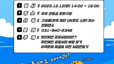 제4회 도시재생을 여는 작은 세미나, 참가자 모집 - 주민제안 공모사업 바로 알기       파주시는 12월 12일 파주읍 연풍길 연풍마루(연풍5길 17)에서 진행되는 ‘2023년 제4회 도시재생을 여는 작은 세미나’ 참...