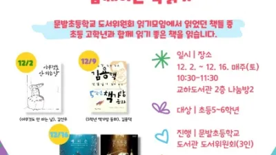 파주시 교하도서관, 어른과 어린이가 함께하는 독서모임 운영 - 책 매개로 세대 간 소통 확장 파주시 교하도서관은 12월 2일부터 16일까지 문발초등학교 도서위원회와 함께하는 ‘어린이 독서클럽’을 진...