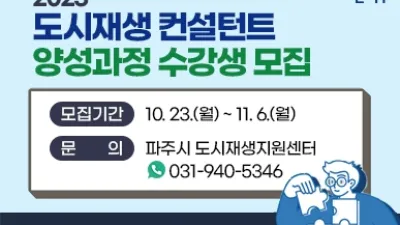 2023-10-25 06:25:53파주시, ‘도시재생 컨설턴트 양성과정’ 참여자 20명 모집