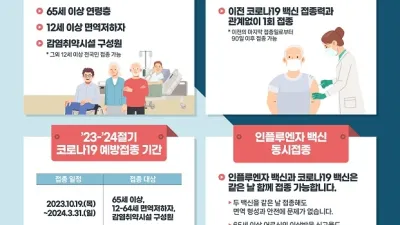 파주시, 코로나19 무료 예방접종 10월 19일부터 실시 - 고위험군 10월 19일부터, 접종희망자 11월 1일부터 접종         파주시는 10월 19일부터 2024년 3월 31일까지 코로나19 무료 예방접종을 전면 실시한다. ...