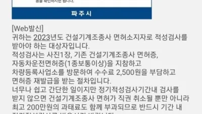 파주시, 건설기계조종사 면허소지자 적성검사 수검 안내 파주시는 건설기계 조종사면허 적성검사 대상자에게 검사 기간 내에 적성검사를 받을 것을 당부하는 공공알림문자를 오는 26일에 발송한다고 밝혔다. 건설기계조...