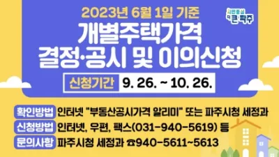 파주시, 2023년 6월 1일 기준 개별주택가격 결정·공시 파주시는 2023년 6월 1일 기준 개별주택(단독, 다가구, 다중, 주상용) 가격을 9월 26일 결정·공시하고 10월 26일까지 주택소유자나 이해관...