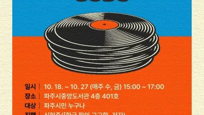 파주시 중앙도서관, ‘한국 대중음악사 6090’강좌 진행 - 「한국 팝의 고고학」 저자, 신현준 작가 초청 파주시 중앙도서관은 10월 18일부터 27일 매주 수, 금요일 총 4회에 걸쳐 한국 대중음악을 주제로 ...