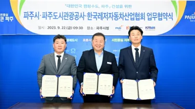 ‘대한민국 캠핑수도, 파주’건설…차별화된 캠핑 산업·문화 기반 시설 구축 - 파주시·파주도시관광공사·한국레저자동차산업협회 3자 업무협약 파주시는 지난 22일 파...