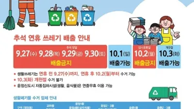 파주시, “추석 연휴 쓰레기 수거도 쉽니다” - 연휴 기간(9.28.~10.3.) 상황반 운영…시민 불편 대응 파주시는 환경미화원이 휴무를 보장하기 위해 추석 연휴 기간(9.28.~10.1.)과 개...