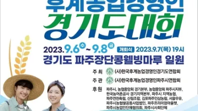 파주시 장단콩웰빙마루 일원에서, 제20회 한국후계농업경영인 경기도대회 개최       파주시는 오는 9월 6~8일 파주시 탄현면 ‘장단콩웰빙마루’ 일원에서 ‘제20회 한국후계농업경영인 경기도대회’를 ...