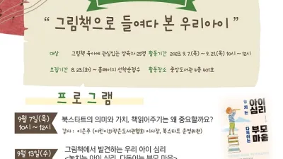 파주중앙도서관, 북스타트 양육자교육 지원사업 선정 - 어린이들의 마음을 들여다보다       파주중앙도서관에서는 그림책 육아에 관심 있는 양육자들을 대상으로 9월 7일부터 21일까지 ‘북스타트 양육자교육’을 운영한다. &...