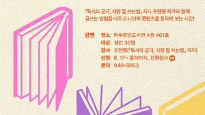 파주시 중앙도서관, 매주 화요일 오후 7시‘서평쓰기 강좌’ 운영 - 조현행 작가와 함께 글 쓰는 방법 배운다       파주시 중앙도서관은 9월 12일부터 10월 24일까지 성인을 대상으로 하는 <독서의 완성, 서평...