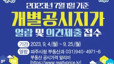파주시, 2023년 7월 1일 기준 개별공시지가 열람 및 의견제출 접수         파주시는 2023년 7월 1일 기준으로 산정한 개별공시지가에 대해 9월 4일부터 25일까지 열람 기간을 운영하고 토지 소유자 및 이해 관계인의 의견...