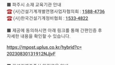 파주시, 건설기계조종사 안전교육 이수 안내       파주시는 건설기계조종사 면허소지자에게 안전교육 이수 안내 문자를 지난 3월에 이어 9월 5일에 추가로 발송한다고 밝혔다.   시는 그동안 교육 이수에 따른 사항을 일반우편으로 안내...