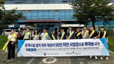 고용노동부, 안전보건공단 휴게시설 의무화제도 홍보 캠페인 “휴게시설 설치 의무 대상, 50인 미만 사업장으로 확대” 고용노동부 고양지청(지청장 조남식. 이하 노동부), 안전보건공단 고양파주지사(지사장 이주갑. 이하 공단)는...
