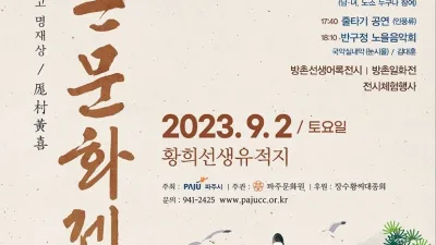 2023-08-25 00:32:42파주시, 9월 2일 황희선생 유적지서‘방촌 문화제’개최