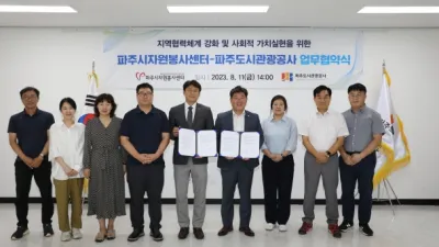 파주도시관광공사, 파주시자원봉사센터와 업무협약식 개최 -지역협력체계 강화를 통한 사회적 가치 실현 공동 모색 파주도시관광공사(이하 공사)와 파주시자원봉사센터(이하 센터)는 11일 사회공헌과 자원봉사활성화를 위한 업무협약을 체결했다....