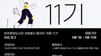 파주중앙도서관, 15일까지 청소년 자원봉사동아리‘자몽’11기 모집 파주중앙도서관이 청소년들의 꿈과 끼를 다양한 활동으로 펼칠 수 있는 청소년 자원봉사동아리 ‘자몽’ 11기를 오는 15일까지...