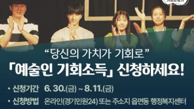 파주시, ‘경기도 예술인 기회소득’7월 20일 첫 지급 - 지역 예술인의 창작 활동 독려…8월 11일까지 접수 파주시는 지역 예술인의 창작 활동을 독려하기 위해 경기도와 공동으로 추진하는 &lsqu...