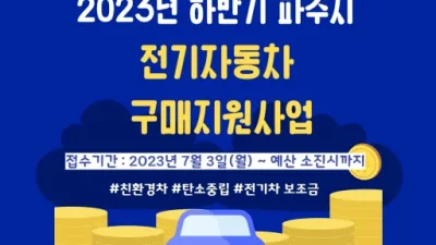 파주시는 대기질 개선과 전기자동차 보급 활성화를 위해 7월 3일부터 2023년 하반기 전기자동차 구매 지원 신청을 받는다. 시는 이번 사업에서 상반기 승용차 잔여 물량과 화물 물량을 조정해 하반기 물량 총 421대(승용...